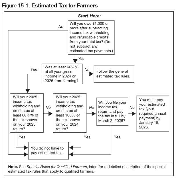 Bill’s gross farm income was 70% of his overall gross income for tax year 2024 and 60% in 2025. Since his 2024 gross farm income was greater than 2/3 of total, he therefore automatically qualifies as a “2/3 farmer” for both 2024 & 2025. Even if 2025 gross farm income dropped below 2/3. In this case, he would need 2026 gross income to be at least 2/3 from farming to qualify in 2026 since 2025 was less than 2/3 from farming.