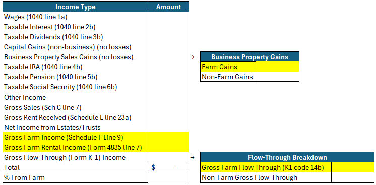 “Gross” means before deductions, so even if your farming net profit (after deductions) is not 2/3 of your total take home profit, you may qualify. I have built the following spreadsheet to calculate gross farm income with the highlighted cells representing eligible farm sources:
